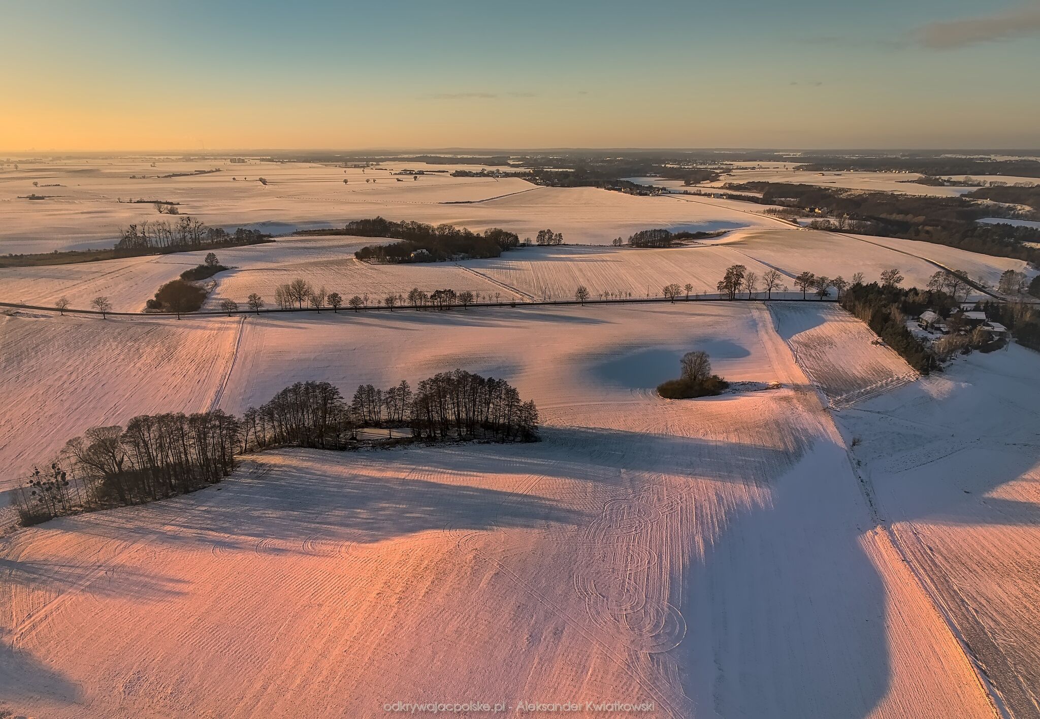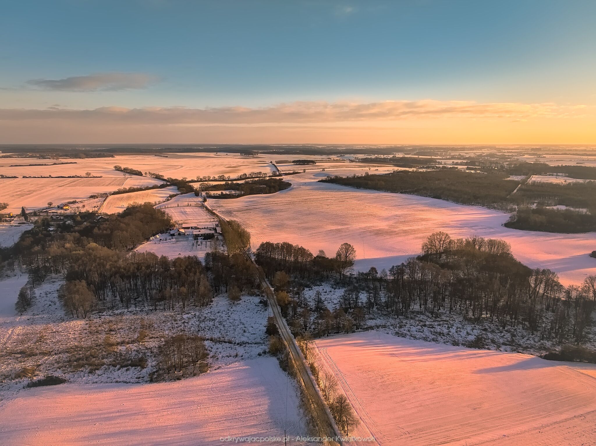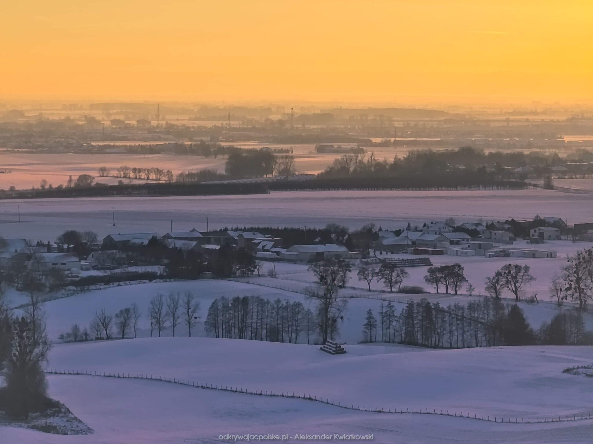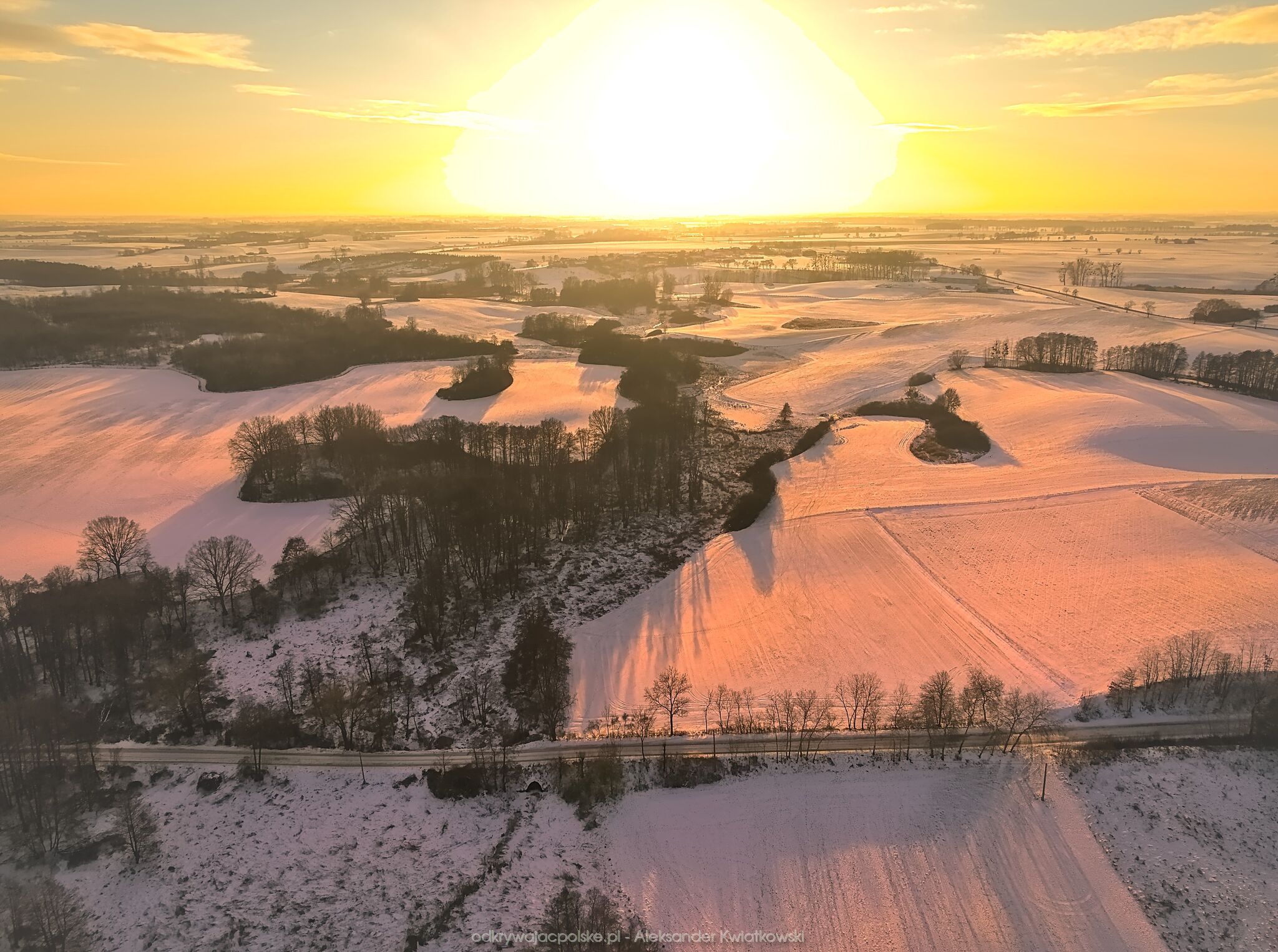 Dzień wcześniej pojechałem na zachód słońca w to samo miejsce. Wtedy drzewa były oszronione po nocnej mgle i bardzo zimnej temperaturze. Tego dnia pogoda była inna. Prognozowany był dość ładny zachód słońca.
